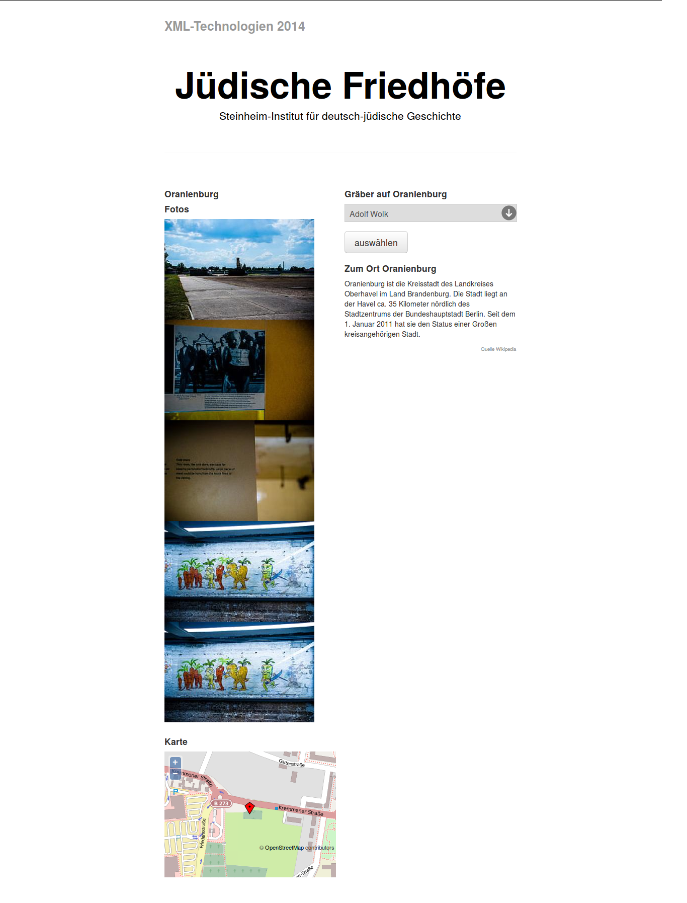 … [...Weiterlesen/more...]Im Rahmen der Vorlesung XML-Technologien (Web Data and Interoperability) im Sommersemester 2014 bestand die Aufgabe der Teilnehmer darin, selbständig ein Softwareprojekt durchzuführen. Neben den technologischen Vorgaben in Form von verschiedenen zu verwenden Techniken aus dem Bereich der XML-Technologien sollte auch ein Datensatz aus dem Bereich Open Cultural Data verwendet werden. Hierzu sollten die Teilnemer einen der Datensätze wählen, welcher für den Coding Da V1nc1 Kultur-Hackkathon veröffentlicht wurde. Ausgehend von diesem wurde ein Use-Case gewählt und eine Applikation implementiert. Im Folgenden sind die einzelnen Projekte aufgeführt. Zwei Welten – Berlin damals und heute | Jüdische Friedhöfe |  | Die für Smartphones und Desktopgeräte optimierte Webanwendung „Zwei Welten – Berlin damals und heute“ (http://zwei-welten.meier-benjamin.de) verwendet automatisch extrahierte und mit Bildern aufbereitete Informationen aus der freien Enzyklopädie Wikipedia, um für Besucher das Erlebnis von historischen Stadtszenen informativer zu gestalten.Hierfür nutzt das Projekt als Datenquelle historische Stadtansichten von Berlin, die im Zuge des Coding da Vinci Kultur-Hackathon unter dem Titel „Schichten der Geschichte“ vom Stadtmuseum Berlin zur Verfügung gestellt wurden.Zusätzlich bieten eine interaktive OpenStreetMap-Karte mit Markern für dargestellte Gebäude, sowie qualitativ hochwertige Bilder aus Panoramio und ausgewählten Flickr-Gruppen, ein mehrdimensionales Erlebnis der heutigen Umgebung, wodurch die Verbindung zum historischen Berlin ermöglicht wird. |  | Das Projekt ist ein Webdienst, |
